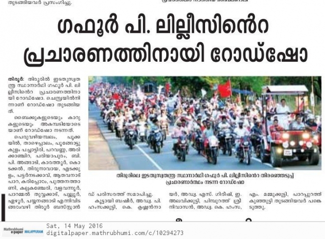 നാടും നഗരവും ഇളക്കി മറിച്ച് റോഡ് ഷോ... പത്ര വാർത്തയിലൂടെ.. 14/May/2016